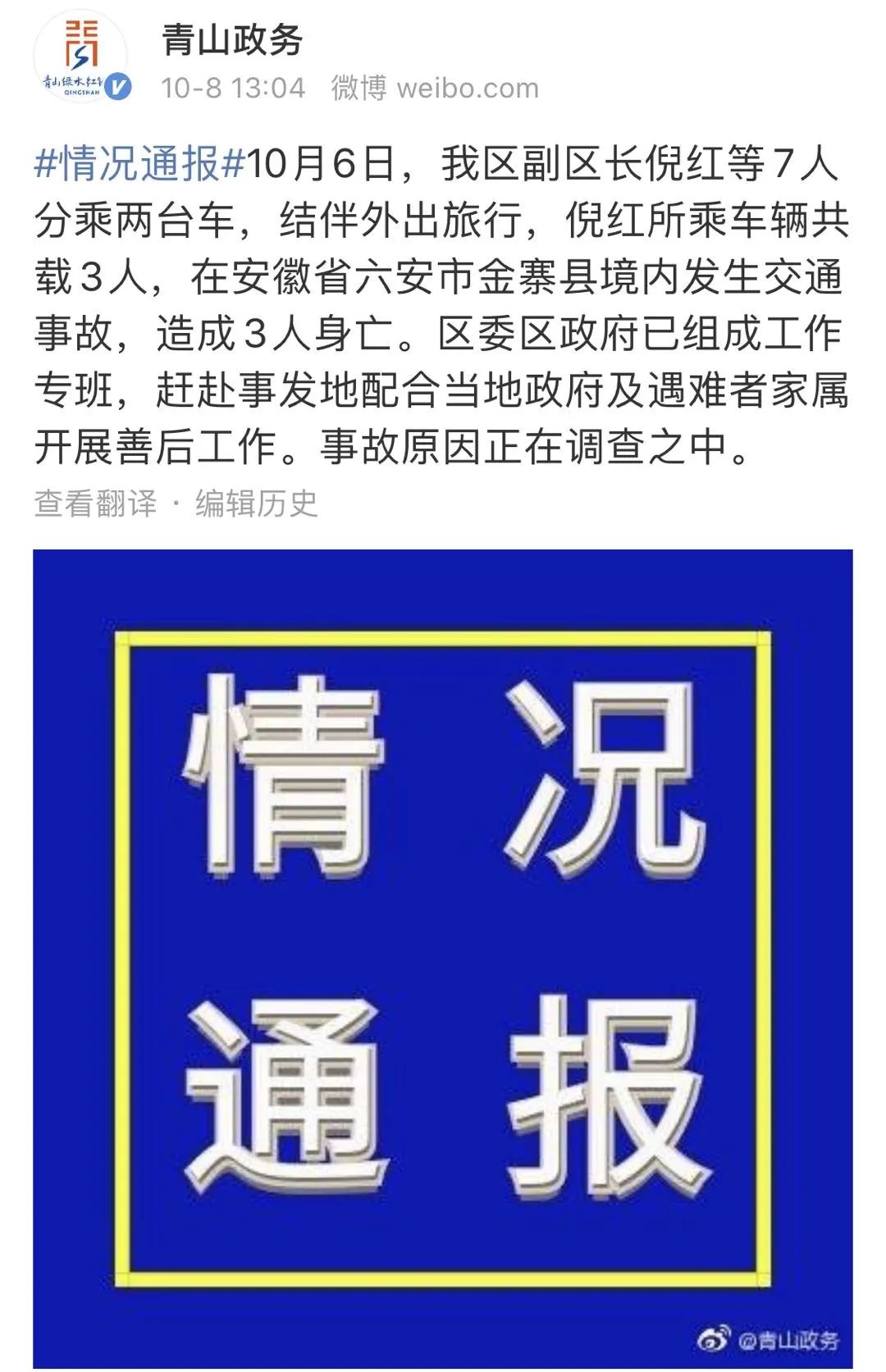 今天(10月8日),湖北省武汉市青山区政府官方微博发布情况通报,10月6日,该区副区长倪红等7人分乘两台车,结伴外出旅行,倪红所乘车辆共载3人,在安徽省六安市金寨县境内发生交通事故,造成3人身亡。