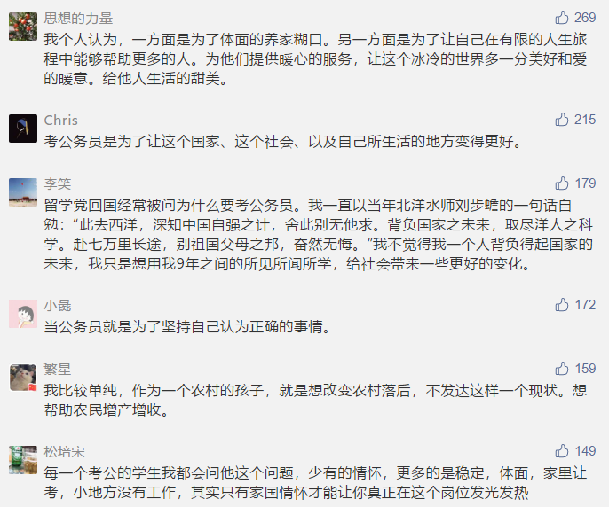 为什么要考公务员?有网友表示,体面而且较稳定。还有网友表示是想改变贫穷落后的家乡。
