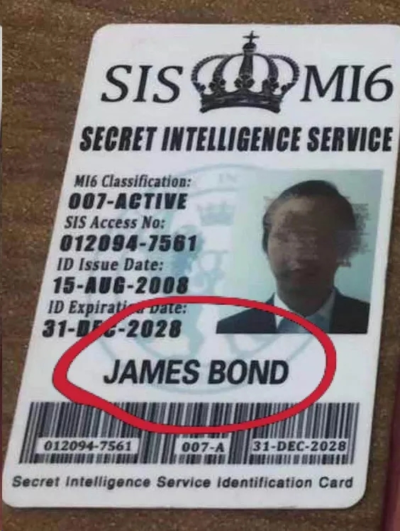 最让民警诧异的是,诸多证件中竟然还有一张印有名为“詹姆斯·邦德(James Bond)——代号007”的英国军情六处工作证!