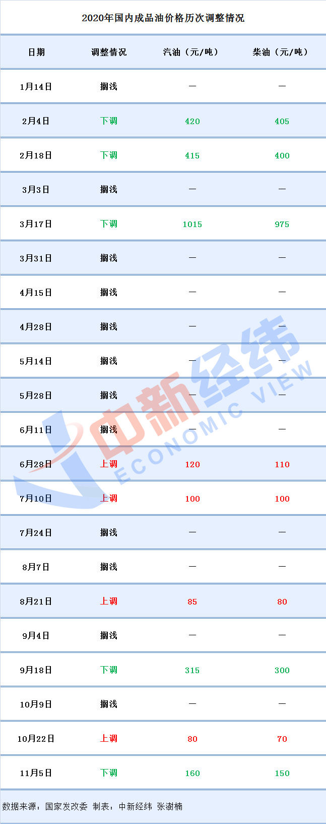 若本轮上调预期兑现,则为年内第五涨,2020年国内成品油调价将呈“五涨五跌十二搁浅”的格局。