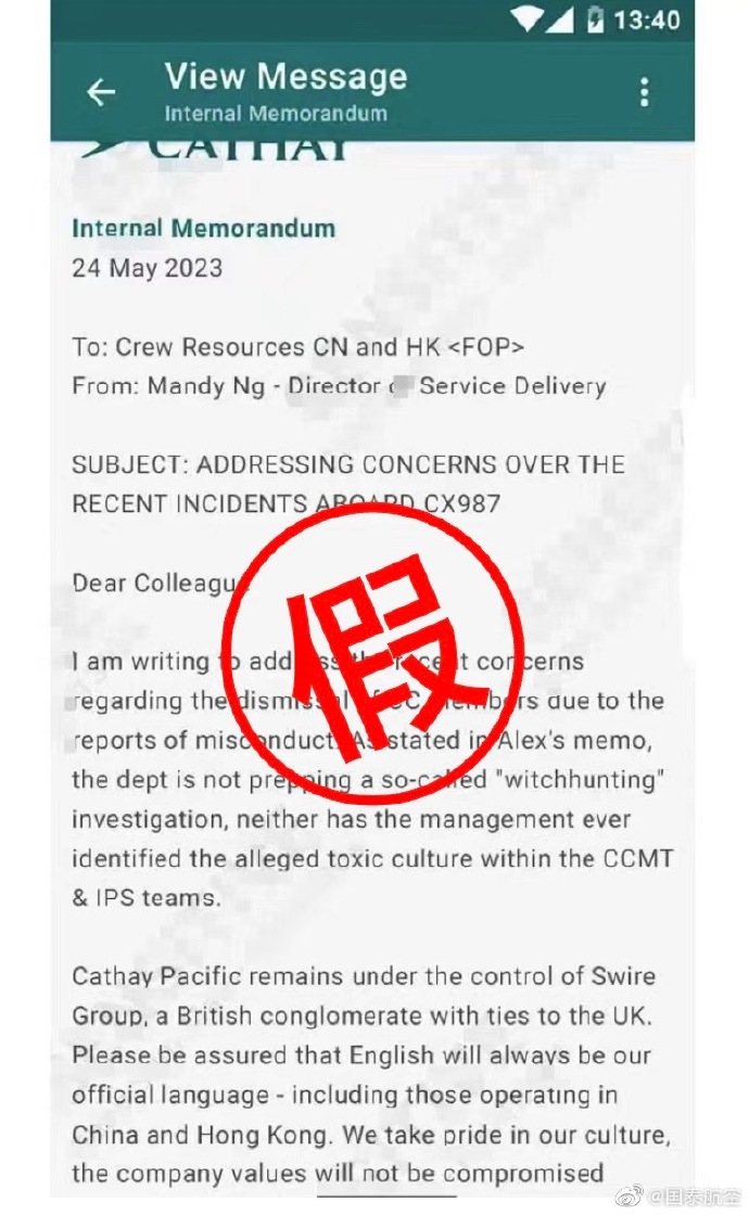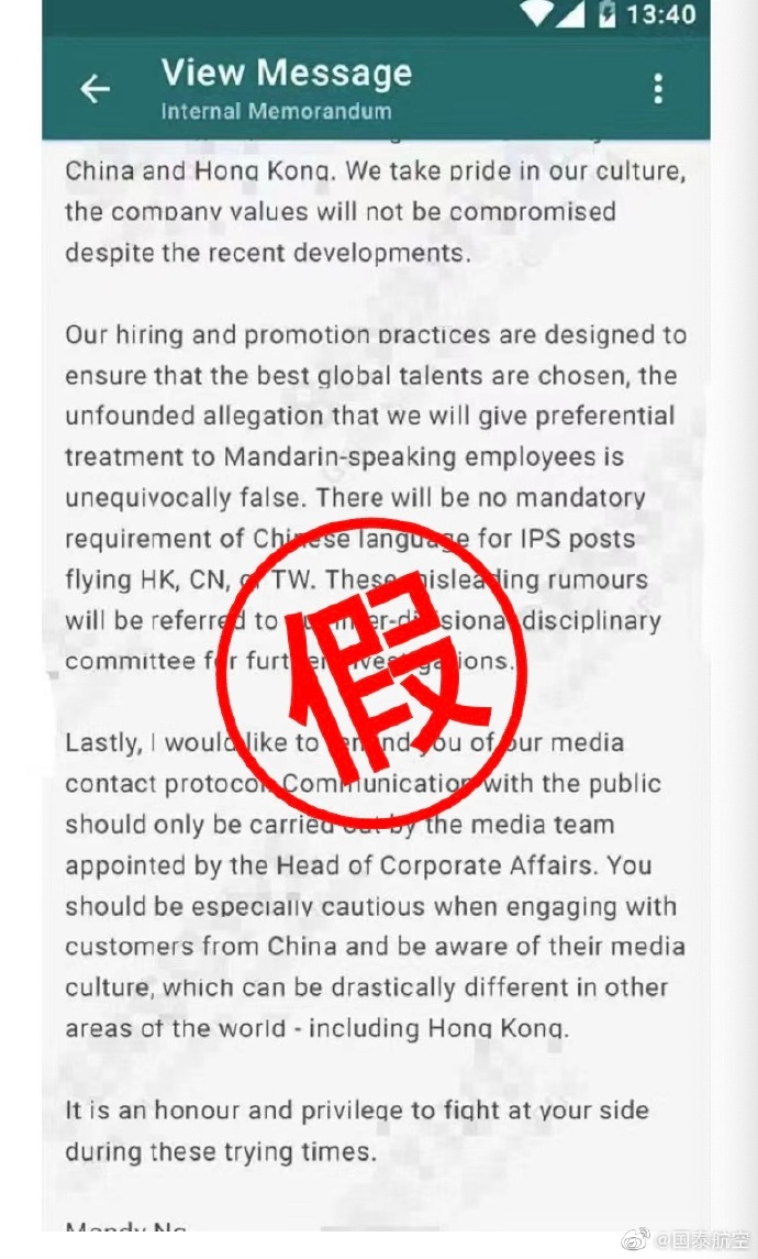 国泰航空:网传有关航空服务董事发出的英文内部信件系伪造 稿源:新湖南2023-05-25 15:36 相链区块链 该文章已上链>> 您的浏览器不支持 video 标签。 您的浏览器不支持 audio 标签。 长沙晚报掌上长沙5月25日讯 据新湖南客户端消息,@国泰航空 5月25日发布声明:我们留意到网络上流传有关国泰航空航空服务董事发出的一则英文内部信件,相关信息为伪造,并不属实。我们不希望这些虚假信息混淆视听,并保留一切追究法律责任的权利。 【作者:】 【编辑:刘天乐】 长沙晚报社版权声明 关键词:国泰航空 >>我要举报