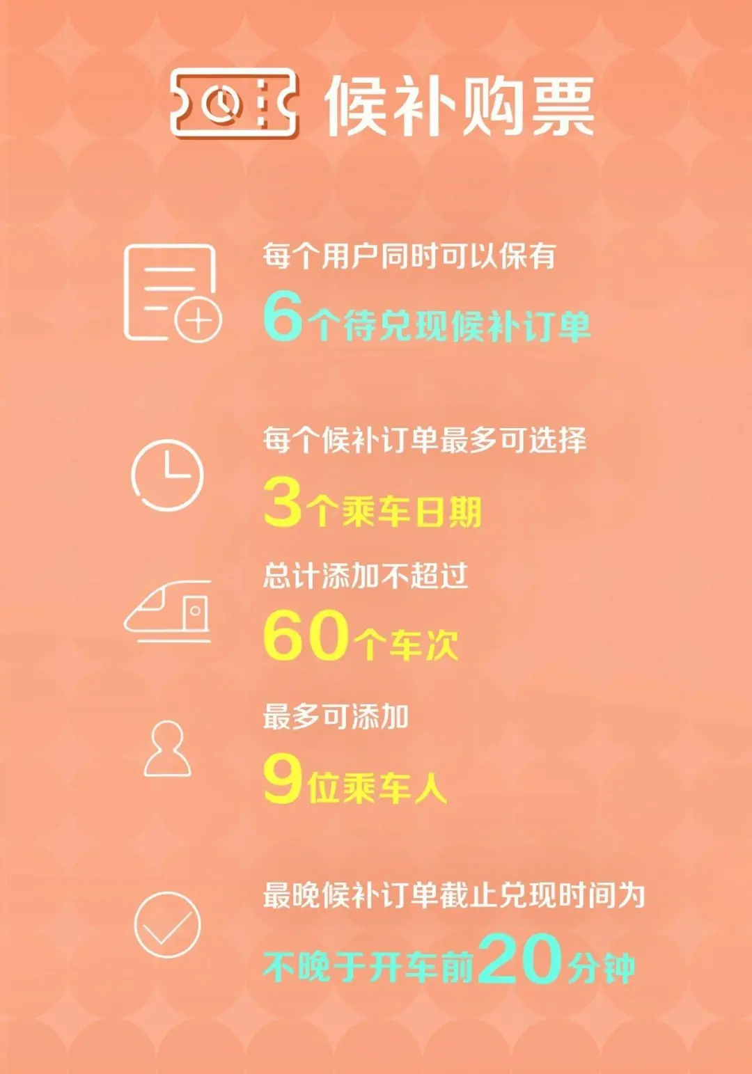 候补购票:每个用户可以有6个待兑现候补订单,每个候补订单最多可选择3个乘车日期,总计添加不超过60个车次。