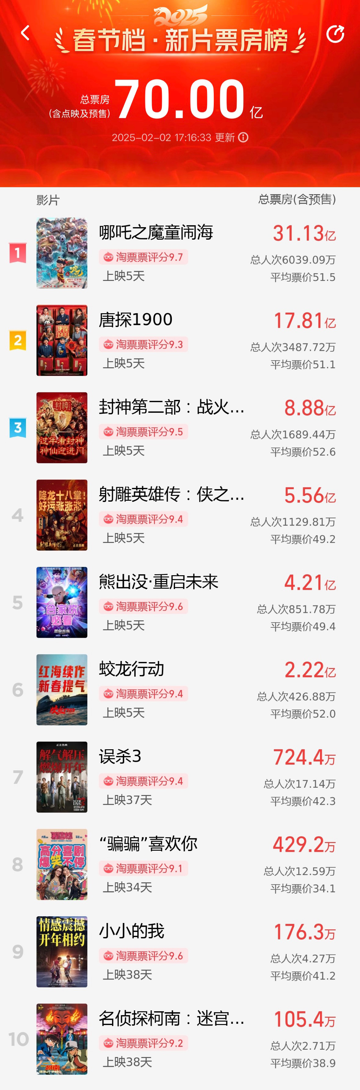 破70亿!2025春节档电影票房再创新高 稿源:央视新闻2025-02-02 17:30 相链区块链 该文章已上链>> 您的浏览器不支持 video 标签。 您的浏览器不支持 audio 标签。 据网络平台数据 截至2月2日17时16分 2025年春节档(1月28日—2月4日)档期 电影总票房(含预售)突破70亿! 再创新高! 此外 2025年中国电影市场累计票房 超北美票房成绩 位列全球第一 《哪吒之魔童闹海》《唐探1900》 《封神第二部:战火西岐》 分列春节档票房榜前三位 其中,《哪吒之魔童闹海》票房突破30亿 【作者:】 【编辑:刘天乐】 长沙晚报社版权声明 关键词:电影 >>我要举报