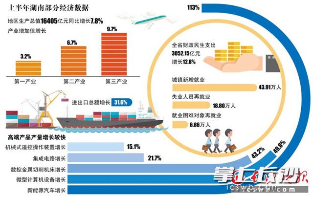 长沙晚报掌上长沙7月19日讯(记者 周丛笑 实习生 郑佳凤)记者从昨日召开的2018年上半年全省经济形势新闻通报会上获悉,上半年,全省实现地区生产总值16405亿元,按可比价格计算,同比增长7.8%,增速较去年同期提高0.2个百分点。其中,第一产业增加值增长3.2%;第二产业增加值增长6.7%;第三产业增加值增长9.7%。
