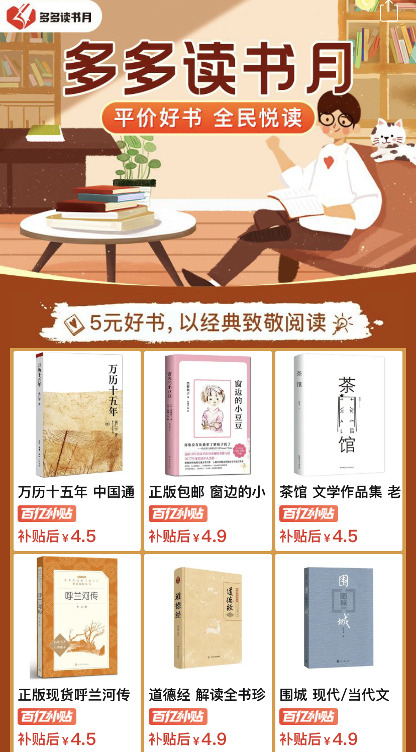 业内人士指出,这是拼多多迄今开展的最大规模“知识普惠行动”。“在过去的一年中,图书行业电商渗透率已接近60%,但仍有大量新兴阅读群体的需求未被充分满足。”“多多读书月”负责人表示,此次活动不设满减、发券门槛,不用比价,直接补贴,以进一步降低阅读门槛,推动知识普惠,让更多“拼书人”切实享受阅读的快乐。此外,在“多多读书月”期间,平台将持续联合各大出版社,不断更新补贴书目,同时协调物流保障等,为广大读者提供优质的服务。