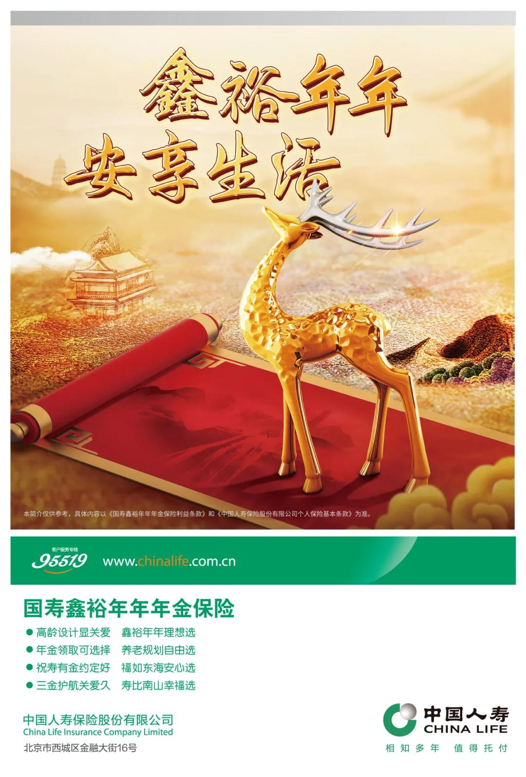 (中国人寿寿险公司2021年第2季度的综合偿付能力充足率为267.69%,核心偿付能力充足率259.03%,已达到监管的要求。公司最近一期的风险综合评级,即2021年第2季度的风险综合评级结果为A类。相关数据以公司公开披露信息为准。本文内容仅供参考,具体以《国寿鑫裕年年年金保险利益条款》和《中国人寿保险股份有限公司个人保险基本条款》为准。详情请咨询中国人寿客户服务专线95519或到当地中国人寿寿险公司营业网点咨询。)