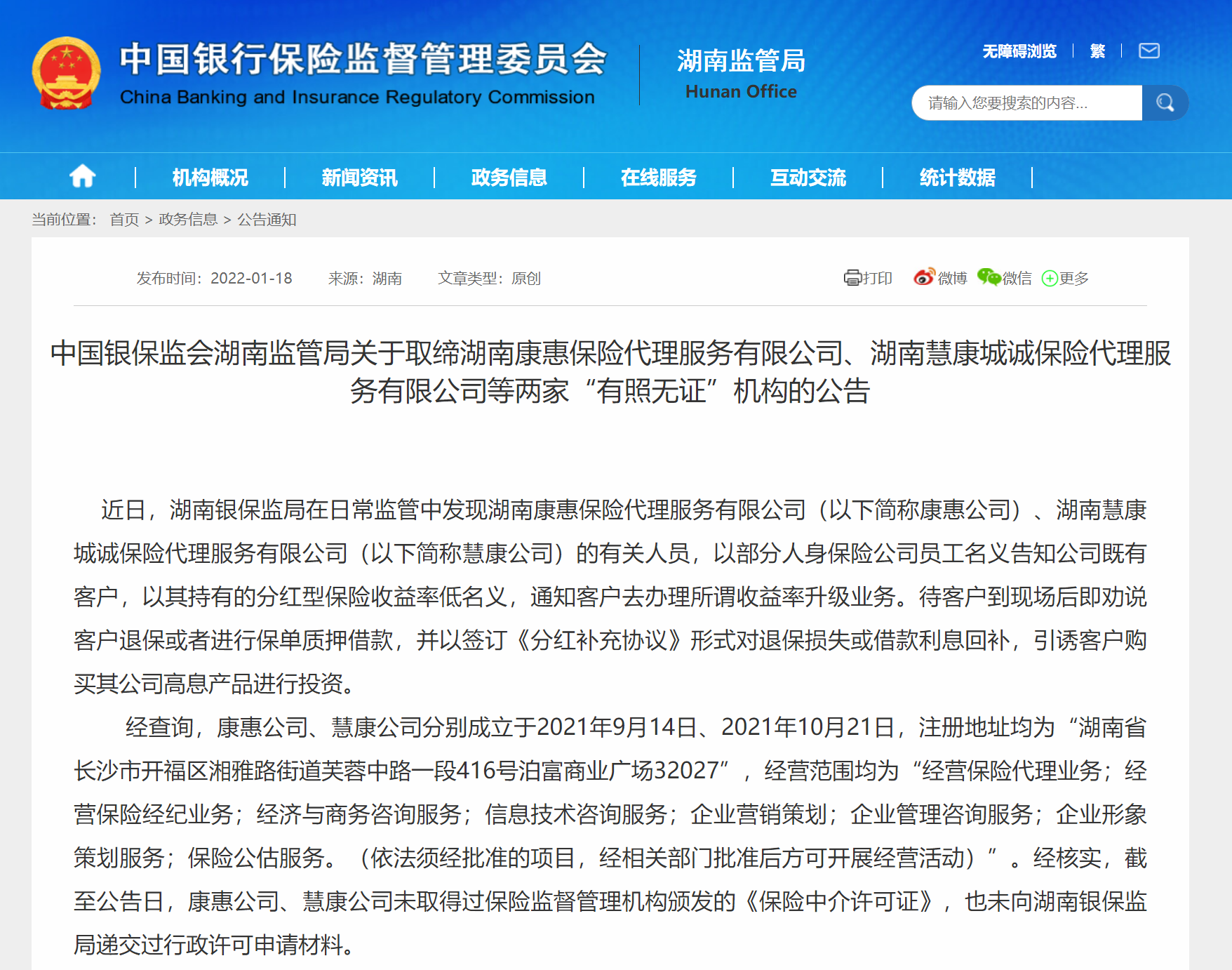 经查询,康惠公司、慧康公司分别成立于2021年9月14日、2021年10月21日,注册地址均为湖南长沙。经核实,截至公告日,康惠公司、慧康公司未取得过保险监督管理机构颁发的《保险中介许可证》,也未向湖南银保监局递交过行政许可申请材料。