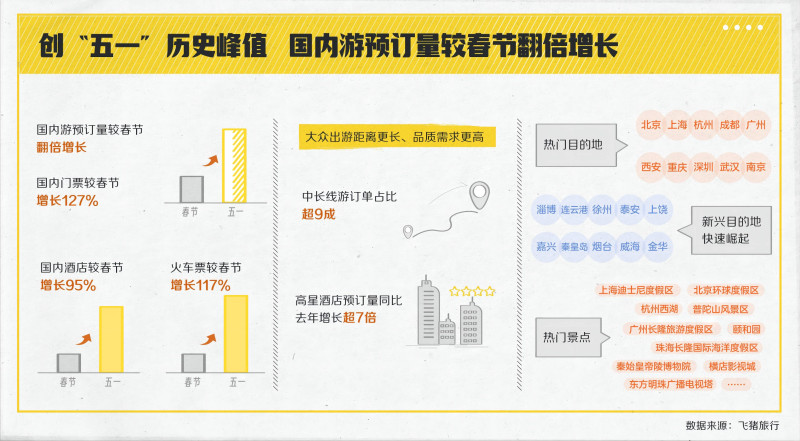 旅游消费需求井喷之外,旅游消费品质也在稳步提升。飞猪数据显示,“五一”假期,整体客单价同比去年又提升了约50%。从订单占比来看,时间长、体验项目多的中长线游订单占比已突破九成;高星酒店的预订量同比去年劲增超7倍。