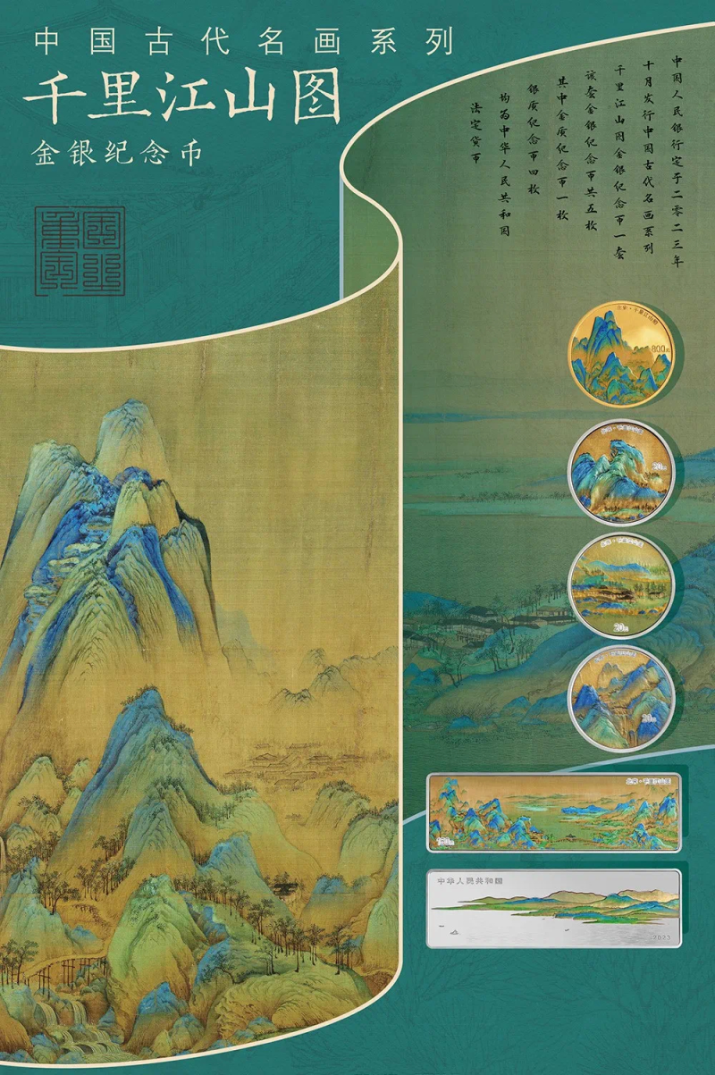 该套金银纪念币共5枚,其中金质纪念币1枚,银质纪念币4枚,均为中华人民共和国法定货币。其背面图案均为《千里江山图》局部场景,并刊“北宋·千里江山图”字样及面额。《千里江山图》是北宋王希孟创作的绢本设色画,现收藏于北京故宫博物院,被誉为中国十大传世名画之一,不仅在中国绘画艺术地位上具有较高的发行价值,且有助于弘扬“绿水青山就是金山银山”的生态环保理念,表达“江山就是人民”的美好祝愿。