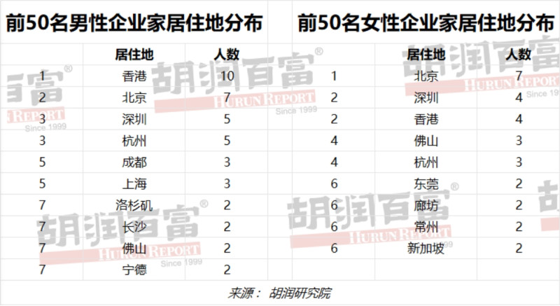 从居住地来看,前50名中国男性企业家中,居住在香港的最多,有10位,其次是北京7位,深圳和杭州各有5位,成都和上海各有3位,洛杉矶、长沙、佛山、宁德则各有2位;而前50名女性企业家中,居住在北京的最多,其次是深圳和香港;百富榜总榜企业家中,居住在北京的最多,其次是深圳和上海。