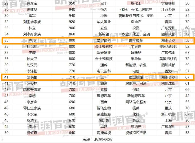 具体来看,居住地为长沙的两位上榜男性企业家分别为排在35位的爱尔眼科陈邦(800亿元)、排在41位的三一梁稳根(710亿元)。据悉,作为全球化眼科医疗集团,爱尔眼科深耕眼健康事业21年,目前已拥有遍布全球的800余家专业眼科医疗机构, 超1500万的年门诊量、超120万的手术量,辐射已逾30亿服务人口。而从一家湘中小镇的民营企业发展成全球领先的工程机械制造商的三一,近日再次获中国品牌500强荣誉称号,以717.91亿元的品牌价值排名第159名,高居工程机械行业第一。