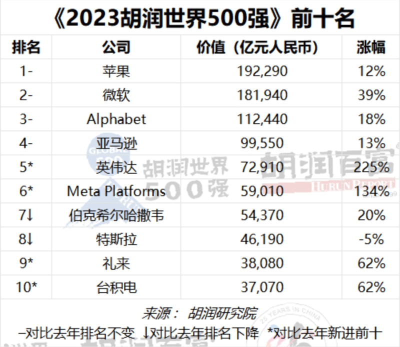 世界十大最具价值的公司总价值比去年增加18万亿元,达到89万亿元,占胡润世界500强企业总价值的23%,其中英伟达、Meta Platforms、礼来和台积电新进前十。苹果以19万亿元价值蝉联世界上最具价值的公司;微软以18万亿元排名第二;Alphabet排名第三,增长18%,至11万亿元;亚马逊排名第四,增长13%,至10万亿元;芯片制造商英伟达价值增长两倍多,成为全球第5家价值达万亿美元的公司。