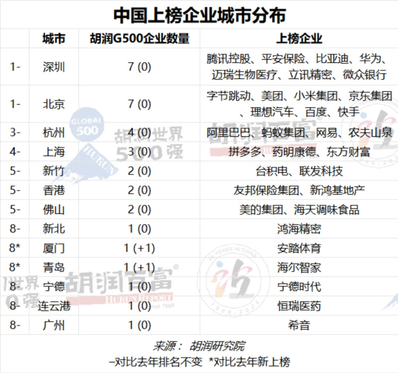 榜单显示,33家中国企业进入胡润世界500强,以台湾的台积电为首,其次是腾讯和阿里巴巴。有5家公司新上榜,依次是理想汽车、快手、安踏体育、立讯精密和海尔智家。价值增长最多的是台积电,增长1.4万亿元,其次是腾讯,增长9300亿元,拼多多增长6700亿元。这些中国公司分布在13个城市,以深圳和北京为首,各有7家,杭州有4家。平均年龄为27岁,远低于整个榜单的平均年龄68岁。
