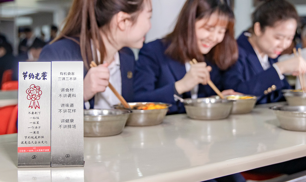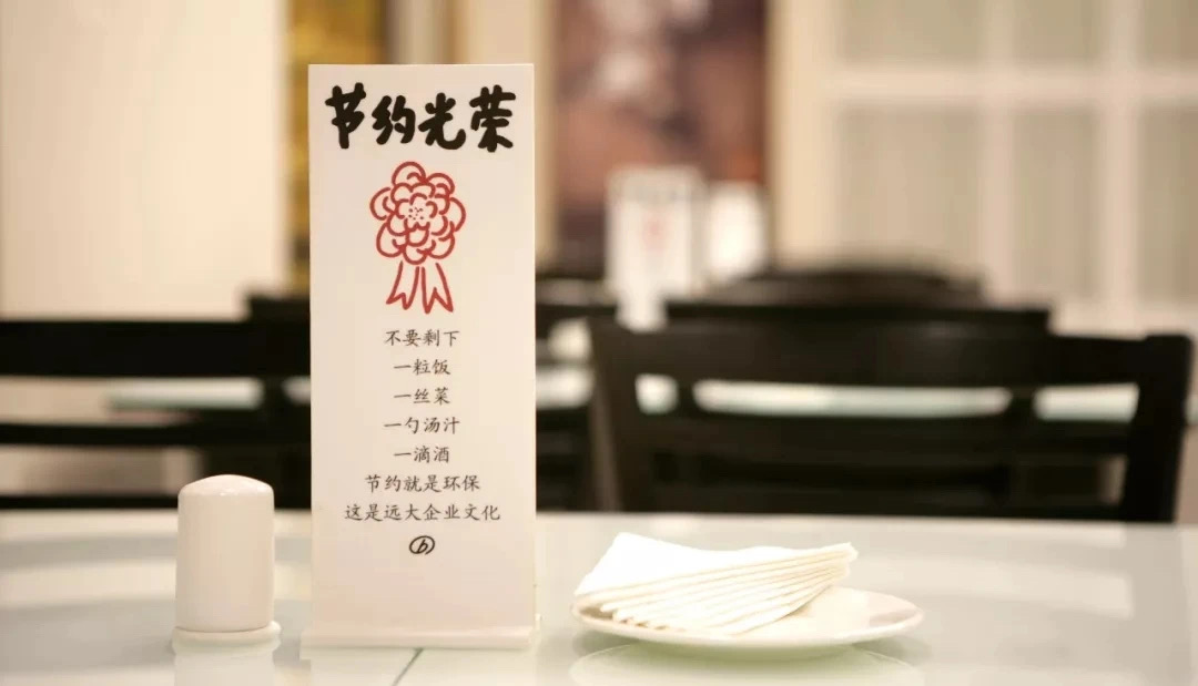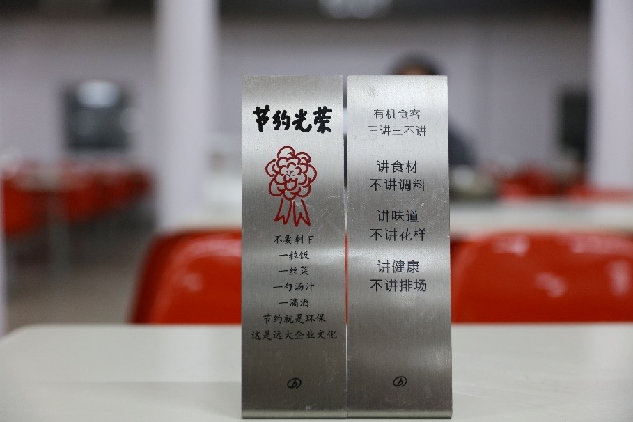 走进远大集团的食堂,在食堂墙上、取餐处随处可见“光盘公约”“温馨提示”等各种抵制餐饮浪费的提示。在每张餐桌上,都摆放了一个“节约光荣”的提示牌,上面写着“不要剩下一粒米、一丝菜、一勺汤汁、一滴酒,节约就是环保,这是远大企业文化”,并提示“三粒饭,一丝肉,二片菜属于浪费”,这样的提示牌,即使在客人餐桌上也不例外。