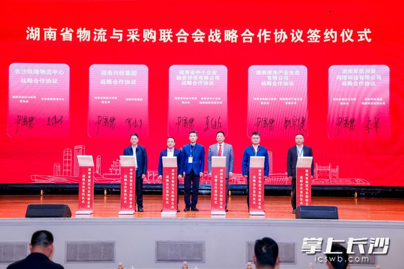 在年会现场,湘物联与长沙铁路物流中心、湖南兴旺集团、省中小企业融资担保公司、福田戴姆勒汽车(湖南绿净产业生态公司)、湖南军凯同盛网络科技公司签订战略合作协议,凝聚起更多全省物流行业的智慧和力量。