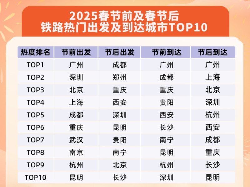 《报告》显示,铁路节前热门出发城市主要以高校及务工人员相对集中的一线城市和中心城市为主,主要有广州、深圳、北京、上海、成都、重庆、武汉、南京、杭州、昆明。节后的热门出发城市则相对集中在成都、郑州、重庆、西安、深圳、昆明、贵阳、南宁、北京、长沙等,客流结构主要是返程的上班族和游客。