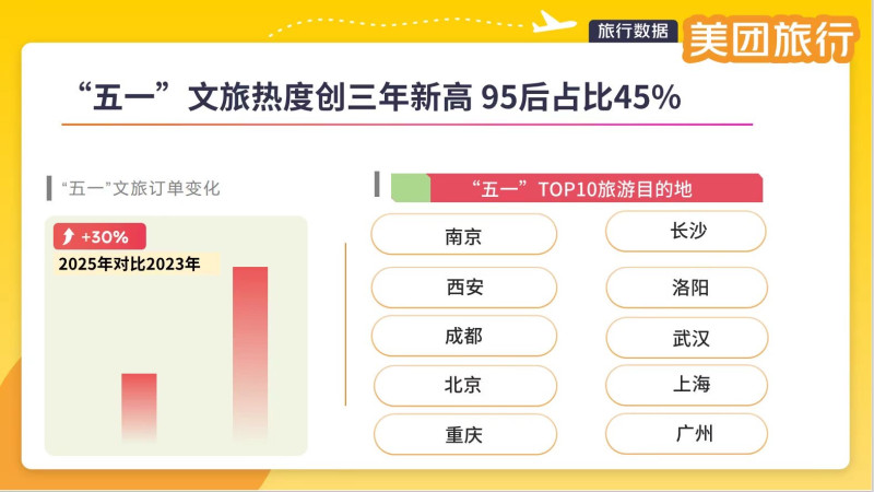 长沙晚报掌上长沙5月5日讯(全媒体记者 吴鑫矾)音乐节人头攒动、多地景点“约满”“售罄”、县城五星酒店一房难求、老字号美食排队1小时起……5月5日,美团旅行发布2025“五一”假期吃喝玩乐消费洞察。据美团旅行数据,在味蕾游、演出游、赶海游、奔县游等多样玩法推动下,人们出游热情高涨,今年“五一”假期,文旅热度创近三年新高,文旅订单较2023年同期增长30%,全国TOP10热门目的地为南京、西安、成都、 北京、重庆、长沙、洛阳、武汉、上海、广州,其中,由异地游客贡献的餐饮堂食线上交易额较2023年激增189%。