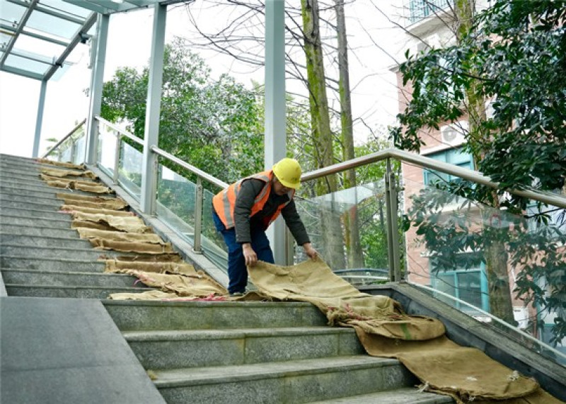 早在寒潮来袭前,长沙市物业管理办公室就已全面部署低温雨雪冰冻天气安全防范工作。各物业服务企业迅速召开动员部署会,制定专项工作方案,全面盘点融雪剂、铁锹、防滑垫、保温棉等应急物资,组建应急队伍,明确分工、责任到人。