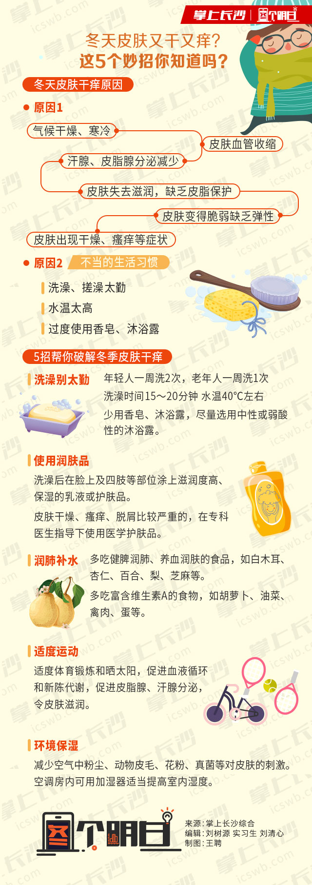 冬季皮肤干痒怎么办?长沙市中医医院(长沙市第八医院)皮肤科主任张源副主任医师介绍,冬季护肤的关键是减少角质层水分、油脂的散失,保持皮肤的润泽。对单纯的季节性皮肤干燥、瘙痒等问题,建议日常生活中从以下5个方面入手,可使症状得到很大程度的改善;持续性、反复性皮肤瘙痒的患者,则应到医院皮肤科诊治。