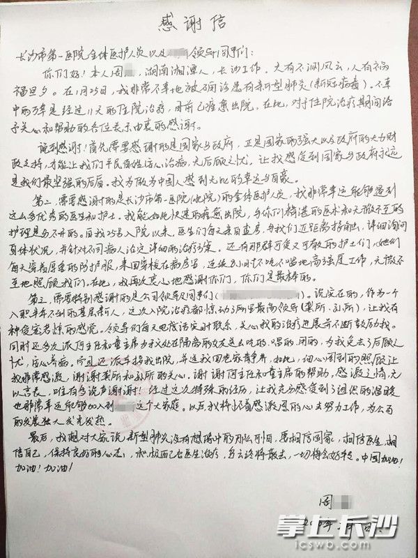 这是两封来自长沙市公共卫生救治中心(长沙市第一医院北院)隔离病区两位治愈出院患者的感谢信。两位患者在医生护士的治疗和护理下,康复出院,顺利回家。