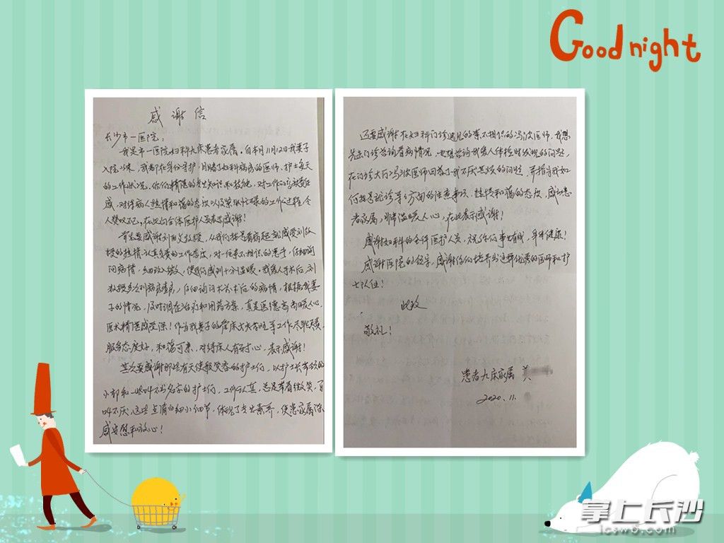长沙晚报掌上长沙12月4日讯(通讯员 李静 郭鼎明)信息化高度发达的今天,手写信件逐渐远去,真挚的笔迹却让人倍加珍惜。近日,长沙市第一医院妇科就收到了这样一封手写信件,字里行间里透着患者家属对医护人员的感谢之情。