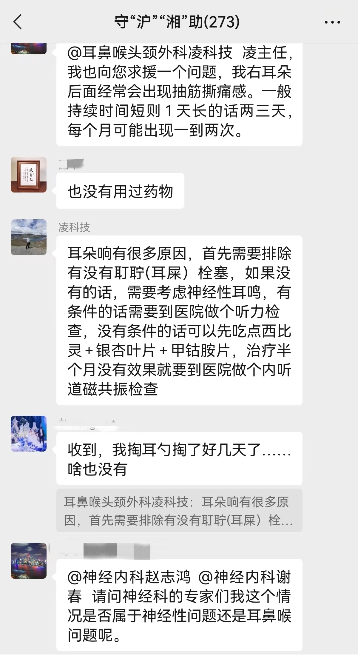 长沙晚报掌上长沙4月26日讯(全媒体记者 杨云龙 通讯员 叶彦宏)“@神经内科赵志鸿 @神经内科谢春 请问神经内科的专家们,我这个情况属于神经性问题还是耳鼻喉问题呢?”“ @耳鼻喉头颈外科凌科技 凌主任,我右耳朵后面经常会出现抽筋撕痛感,一般持续时间短则1天,长的话两三天,每个月可能出现一到两次。”“我是省医乳甲外科张超杰,有问题@我。”这几天,在“守‘沪’‘湘’助”微信群里,湖南省人民医院20多位专家利用自己的空余时间,为在沪湖南人提供免费线上医疗咨询。