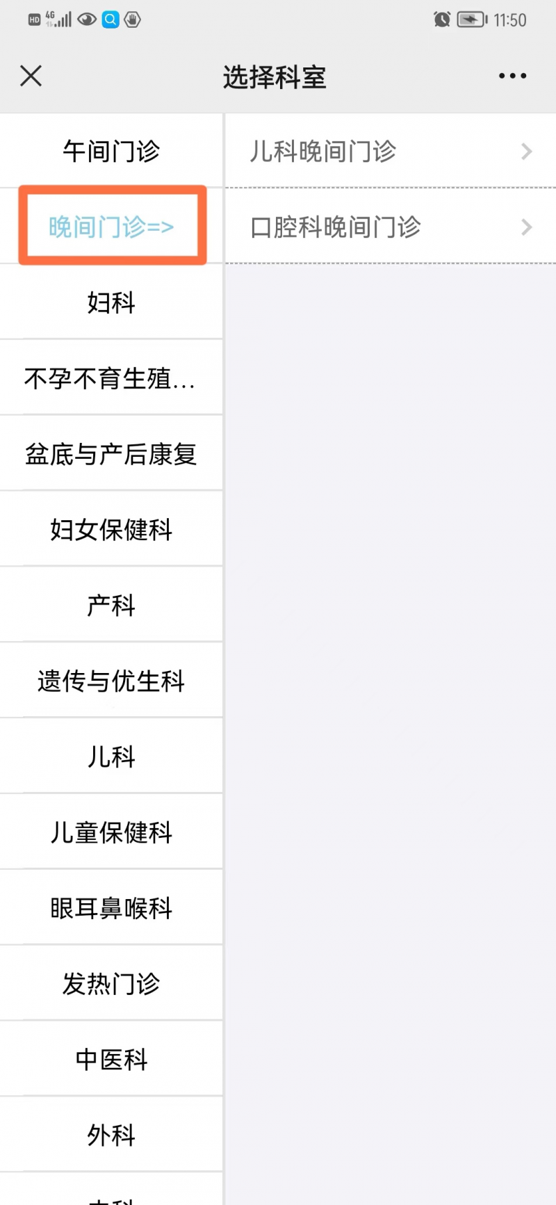 挂号方式:关注医院微信公众号“长沙市妇幼保健院服务号”→服务→预约挂号/当日挂号→午间门诊/晚间门诊→选择相应的科室挂号”。
