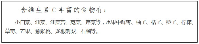 缺乏维生素C的表现:牙龈出血、牙龈炎、皮肤出现瘀点瘀斑、伤口愈合时间长、全身乏力、倦怠等。