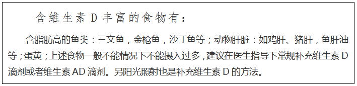 缺乏维生素D的表现:出牙延迟;夜惊哭闹;骨骼生长障碍、骨骼不能正常钙化、变软、易弯曲、畸形。贫血、易患呼吸道感染、体格矮小等。