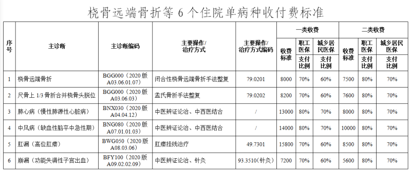 对桡骨远端骨折、尺骨上1/3骨折合并桡骨头脱位、肺心病(慢性肺源性心脏病)、中风病(缺血性脑卒中急性期)、肛漏病(高位肛瘘)、崩漏(功能失调性子宫出血)等6个中医优势明显、治疗路径清晰、疗效确切、质量安全可控的中医优势病种,在试点医疗机构实行住院按病种收付费管理。