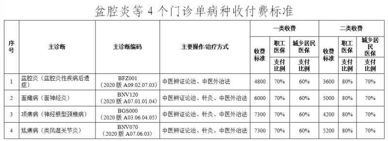 该试点工作对盆腔炎(盆腔炎性疾病后遗症)、面瘫病(面神经炎)、项痹病(神经根型颈椎病)、尪痹病(类风湿关节炎)4个中医临床路径清晰、诊疗规范明确、诊疗技术成熟、医疗质量安全可保障、适合开展门诊诊疗的中医优势病种,在试点医疗机构参照住院管理和支付。