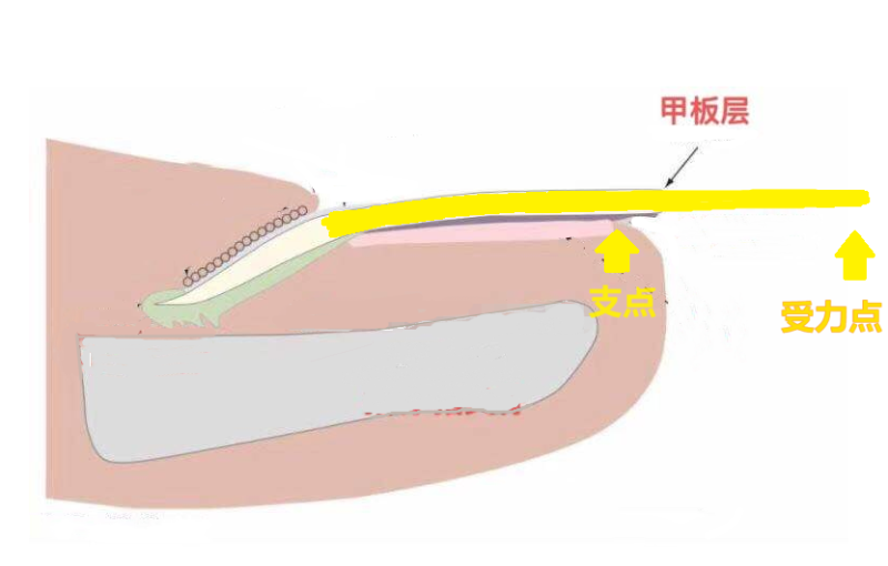 为什么美甲后,指甲容易掀翻呢?长沙市中医医院(长沙市第八医院)星沙院区骨伤科三病区主治医师张开明表示,美甲会让指甲变薄变脆,容易受损,且过长或加装了延长甲的指甲,就像延长了撬开指甲盖的杠杆,轻微的受力或者碰撞都能将甲板层轻易分离、剥脱。美甲的部分为指甲的甲板层,也就是下图标黄的部分。