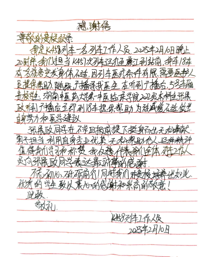 长沙晚报掌上长沙2月13日讯(全媒体记者 徐媛 通讯员 王林华)今日,湖南中医药大学第一附属医院(第一中医临床学院)中医骨伤科学2022级班主任王林华老师收到了一封来自K458次列车工作人员的感谢信。