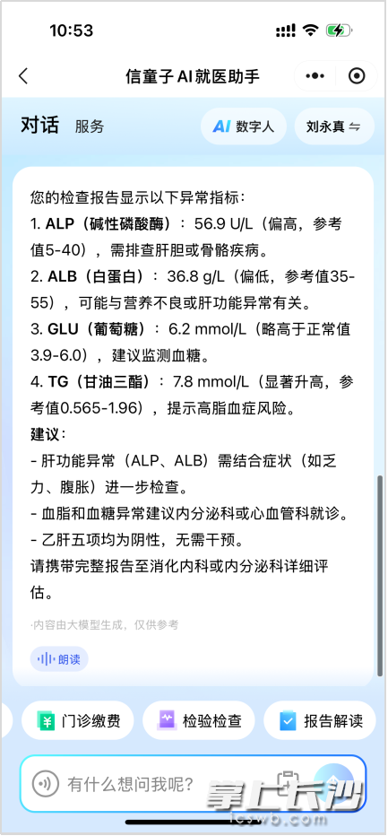 目前,微信搜索打开湖南中医药大学第一附属医院微信服务号小程序,即可使用信童子AI就医助手。AI助手仅解答就医相关问题,严格保障患者个人信息安全及个人隐私。
