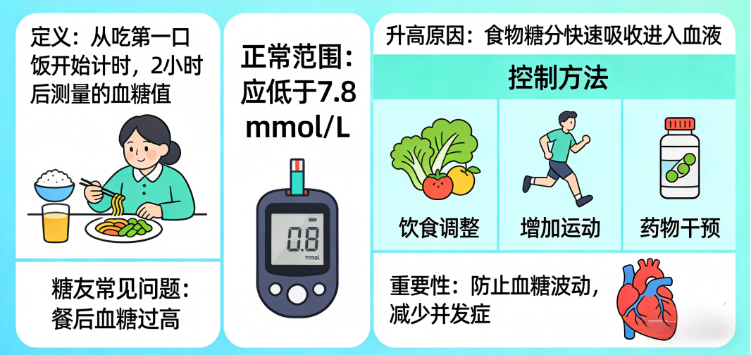 餐后2小时血糖是指从吃第一口饭开始算时间,2小时后测的血糖值。吃饭后,食物中的糖分会被迅速吸收到血液中,导致血糖升高。正常情况下,餐后2小时血糖应低于7.8mmol/L(毫摩尔/升),糖友则往往会出现餐后血糖过高的情况。