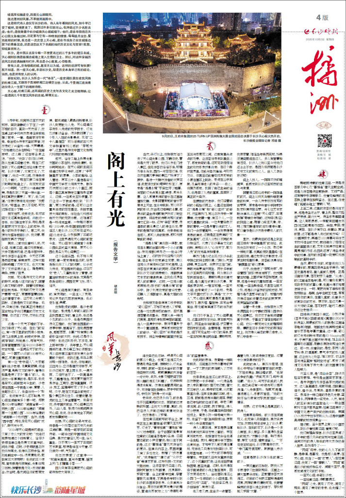 长沙,是中国从古至今唯一不曾更名过的三千多年的楚汉名城,天心阁则仿佛是雄踞古城墙上耸入云霄的卫士。所以,对这种穿越历史风云的经典触摸和打开,我总是小心翼翼,心存敬畏。